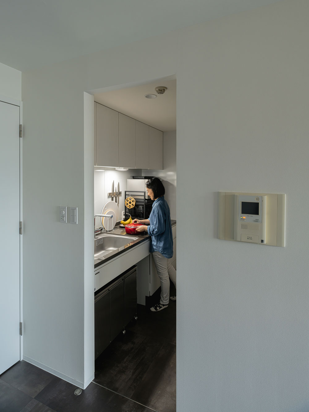 全体的に壁や扉を白にして広く見せつつ、その他は黒・グレーを使って引き締めています。