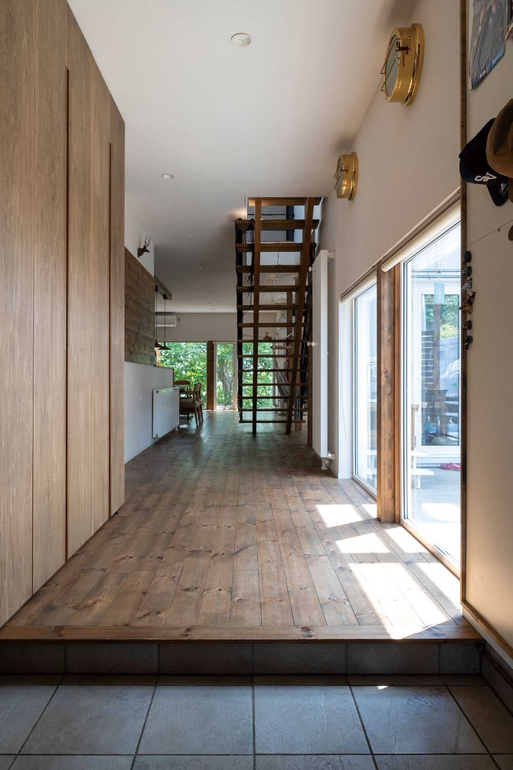 最小限の照明の中に船乗りだった義理の父から受け継いだ船舶照明を、玄関からLDKに行く通路に取り付けました。